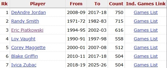 开云官网-祖巴茨代表快船已出战505场 超越格里芬 独享队史第6多