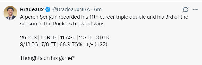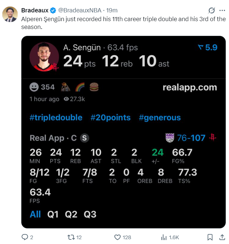 此役阿尔佩伦-申京表现非常出色,首节9分钟里他就已经3中3拿到6分4篮板4助攻,次节9分钟里更是6中3+三分1中1拿到12分5篮板3助攻,半场18分9篮板7助攻1抢断1盖帽1失误,真实命中率77.3%,正负值+24。国王的内线群根本无法限制他分毫。